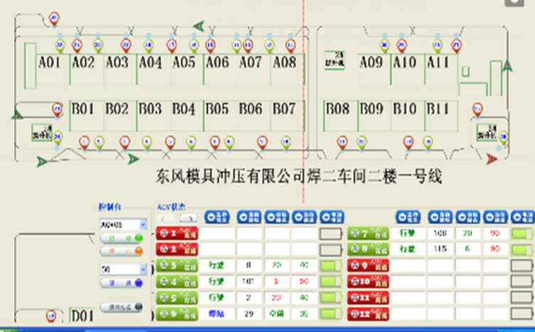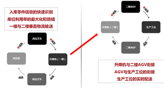 該廠房的第一、二樓間的物流搬運采用7臺升降機完成,二樓生產(chǎn)陣地物流采用AGV完成。一般企業(yè)的AGV在固定的路徑、轉(zhuǎn)運固定的產(chǎn)品,而該項目現(xiàn)場一個AGV回路有近50多個工位,涉及到6個車型的成品、半成品近200多個品種。如何保證車間每一平米、每一個人、每一個物料都安全、精準,是需要重點考慮解決的問題。