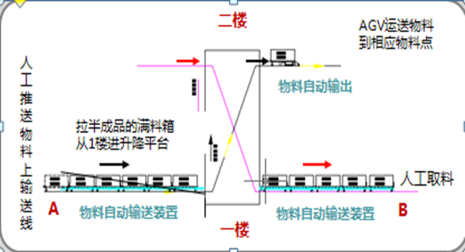 (5)白件半成品或成品空箱由叉車從相應存放點取下,放到A點料車上,依次推到提升機入口自動輸送線前,自動輸送線可預備5~6箱等待,貨物從入口自動進入提升機;到位后,提升機自動上行到二層,由AGV送到需求工位。