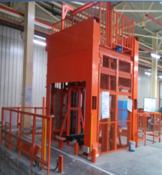 升降機為鏈式四柱結(jié)構,減速電機帶動鏈傳動線體傳動。升降車載重1噸,設置有通過式對開門洞,即一邊進物料,另一邊出物料。升降機構分為三部分組成:往復式升降裝置、與往復式升降裝置對接的地面輸送裝置和安裝在往復式升降裝置內(nèi)的接送料箱的雙向叉式移栽裝置(貨叉)。升降機一層進出口設置地面垂直鏈或鏈板式輸送鏈,可存放4個緩存料箱。料箱按“一”字型排列,自動依次往前行進,直至雙向貨叉將料箱叉入升降裝置。一層升降裝置物料出口亦如進口處,自動出一個,前進一個,按“一”字型排列存放4個料箱,直至人工轉(zhuǎn)移走。這樣可緩解進出口物料堆積。升降機控制系統(tǒng)具有與現(xiàn)場總線控制系統(tǒng)進行數(shù)據(jù)傳輸?shù)哪芰Α?/span>