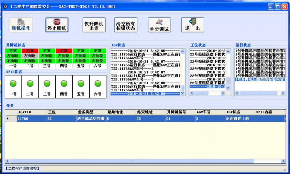 升降機、AGV、呼叫系統(tǒng)組成了物流調(diào)度系統(tǒng):焊接工位的操作人,使用手持終端進行半成品要貨,該信息由WMCS系統(tǒng)處理后,分發(fā)到庫房倉儲系統(tǒng)執(zhí)行,所需物料到達升降機入口后,由控制系統(tǒng)接管,通過物料容器上的RFID標簽,系統(tǒng)判斷調(diào)度路徑,經(jīng)由升降機、AGV運輸,到達指定工位卸貨處(貨到人運輸)任務完成。整體調(diào)度過程,除手持掃碼外,無其他人工操作,主要依靠系統(tǒng)對設備的啟動、停止、運輸路徑進行操控。同時為保證運輸?shù)男,系統(tǒng)對AGV、升降機進行了交通管控,保障了運輸路徑的暢通與物流現(xiàn)場的安全。
