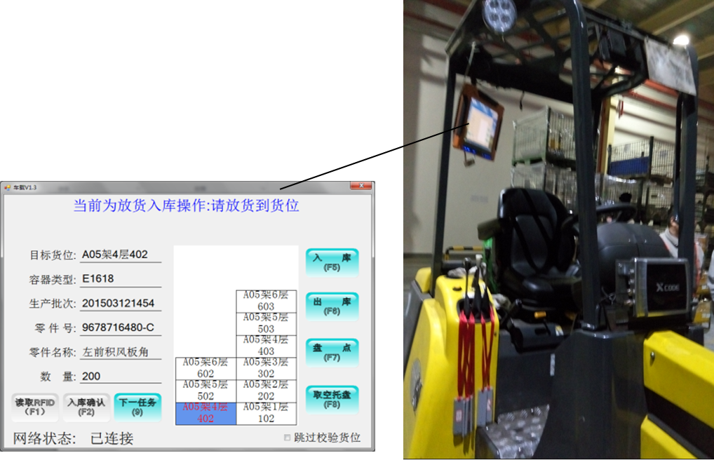 入庫——高位叉車叉取貨物 ,系統(tǒng)通過車載讀寫器讀取該零件箱,并在叉車顯示屏上提醒所對應的庫位編碼,同時相應貨架信號燈、庫位信號燈亮起提醒。將零件箱對號入座至相應庫位,核對庫位標簽與系統(tǒng)顯示庫位一致時,放下零件、確認、系統(tǒng)自動入庫、上賬,庫位信號燈、巷道信號燈熄滅。