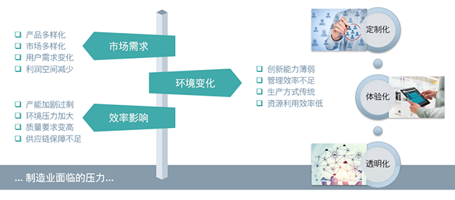 改革開放以來,中國制造加速融入全球產(chǎn)業(yè)鏈,隨著各行各業(yè)的快速發(fā)展,企業(yè)競爭也進入了新的階段。產(chǎn)品與市場的多樣化,需求變化多,產(chǎn)能加劇過剩,人力成本高企,環(huán)境壓力加大,供應(yīng)鏈保障壓力大,都已經(jīng)成為了新常態(tài),企業(yè)普遍存在著創(chuàng)新能力薄弱、管理效率不足、生產(chǎn)方式傳統(tǒng)等困擾,并且客戶對于服務(wù)的期望水平也越來越高,希望有更多的定制化產(chǎn)品、透明化與體驗化的服務(wù)過程與此同時,在數(shù)字化高度發(fā)展的新時代下,客戶獲取的信息渠道廣泛,其偏好與重點也在頻繁變化。企業(yè)需要把關(guān)注點從"產(chǎn)品"轉(zhuǎn)向"客戶",把以客戶為中心的企業(yè)運營作為企業(yè)發(fā)展過程中的思考與行為中心。
